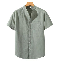 Rnshanger Áo sơ mi nam vải lanh cotton mùa hè Áo sơ mi phong cách giản dị tay ngắn cổ đứng Trung Quốc Áo sơ mi nam dáng rộng mới có túi