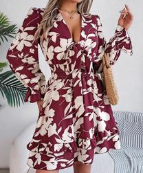 Thanh lịch Knot phía trước dài tay áo shirred eo Ruffle HEM hoa in ăn mặc cho mùa xuân và mùa thu của phụ nữ quần áo